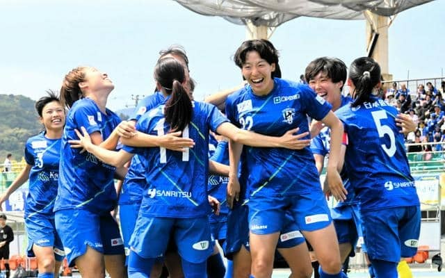 前半、MF北村ほのか選手(22)のゴールで先制し、喜ぶオルカ鴨川FCの選手たち=2026年4月26日午後0時5分、千葉県鴨川市のワタレイスタジアム、八鍬耕造撮影