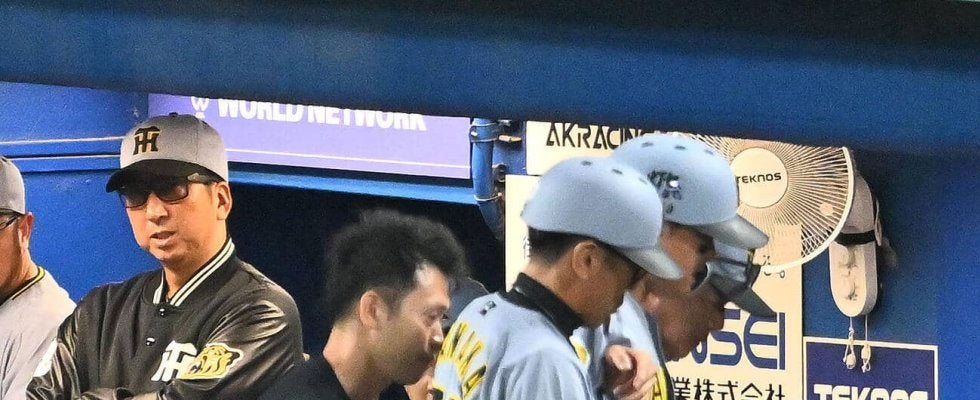 【写真】ヤクルト対阪神 8回表、アクシデントでベンチへ引き揚げる阪神森下翔太を見守る藤川球児監督(後方)(撮影・滝沢徹郎)