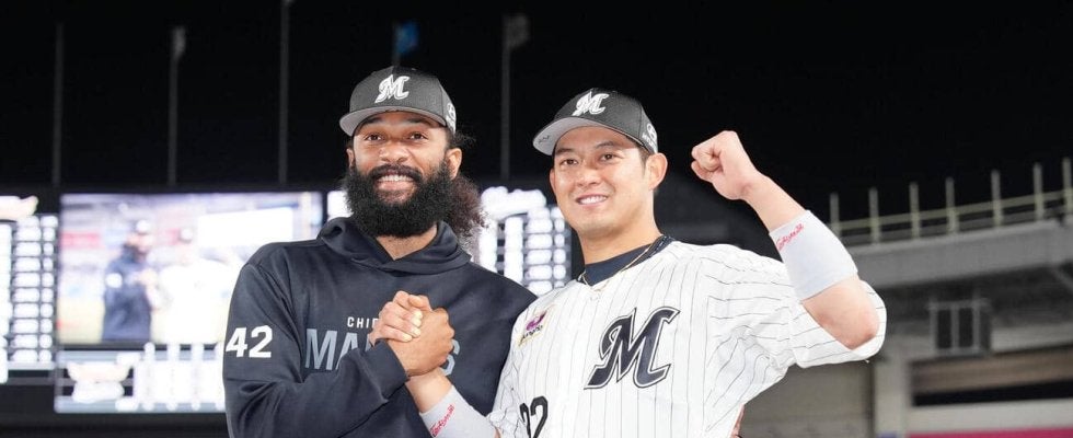 【写真】ロッテ対楽天 笑顔で握手を交わすロッテ佐藤都志也(右)とアンドレ・ジャクソン(撮影・鈴木みどり)