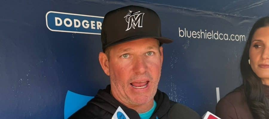 試合前、取材に応じたマーリンズのクレイトン・マッカラー監督【写真:上野明洸】