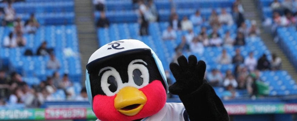 【ヤクルト】つば九郎と阪神トラッキーが“ヘルメット”交換 相手球団のものかぶり「バズーカタイム」 | 野球