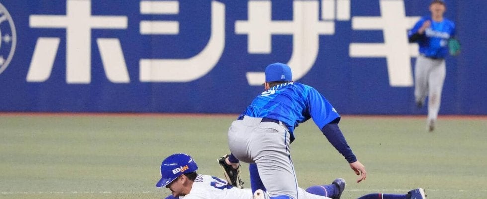 【写真】中日対DeNA 9回裏中日1死一、三塁、盗塁死の尾田剛樹(左)ベースカバーは京田陽太(撮影・森本幸一)