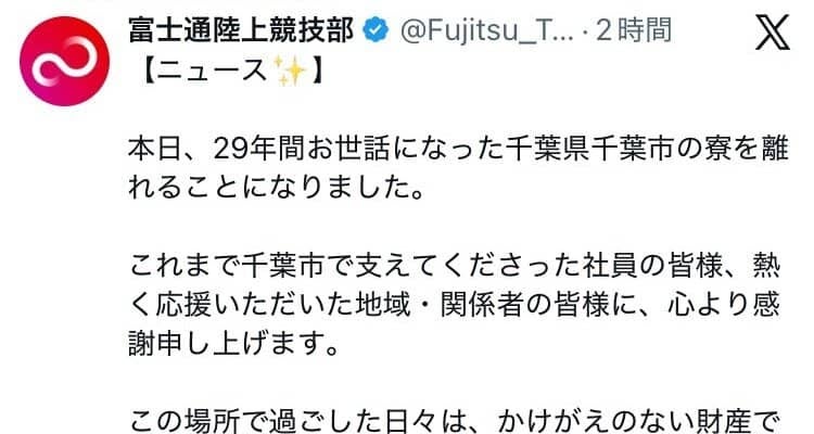 富士通陸上部が30日にチームのXを更新。5月1日から拠点を千葉市から川崎市に移すと発表した。「【ニュース】」とキラキラの…