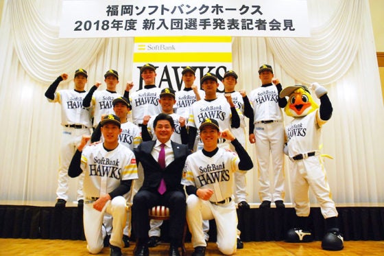7日、ソフトバンクが福岡市内のホテルで新入団選手発表記者会見を開き、育成ドラフトを含む11人のルーキーが顔を揃えた。