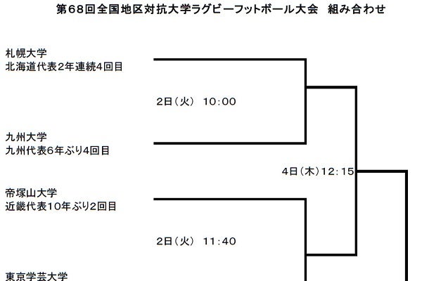 第68回目となる「全国地区対抗大学ラグビーフットボール大会」の組み合わせが決まり、日本ラグビーフットボール協会から発表された。