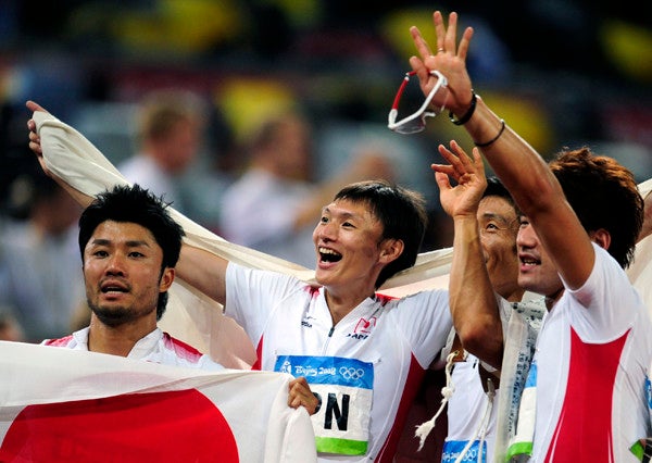 北京五輪4×100mリレーで3走を走り、メダル獲得に貢献した高平(左から2番目)