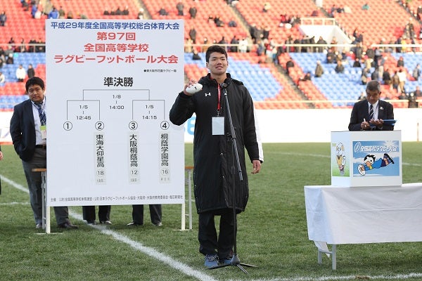 第97回全国高校ラグビー大会(東大阪市花園ラグビー場/12月27日~1月8日)は、1月3日に準々決勝が終わったあと、5日におこなわれる準決勝の組み合わせ抽選がおこなわれ、第1試合では、ディフェンディングチャンピオンの東福岡(福岡)が前年度決勝でぶつかった東海大仰星(大阪第2)と対戦することが決定。第2試合では、春の全国高校選抜大会を制した桐蔭学園(神奈川)と4季ぶりにベスト4入りした大阪桐蔭(大阪第1)が激突することとなった。