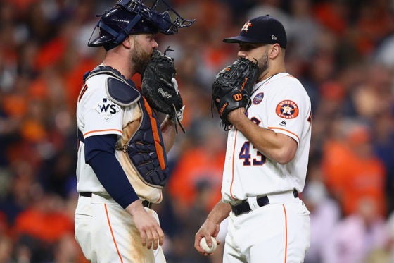 マウンド上で捕手のマキャンとコミュニケーションをとるマッカラーズ・ジュニア【写真:Getty Images】