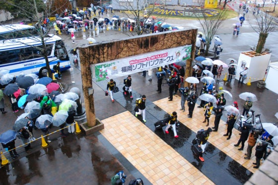 雨の中多くのファンに迎えられキャンプ地に到着したソフトバンクの選手たち【写真:藤浦一都】