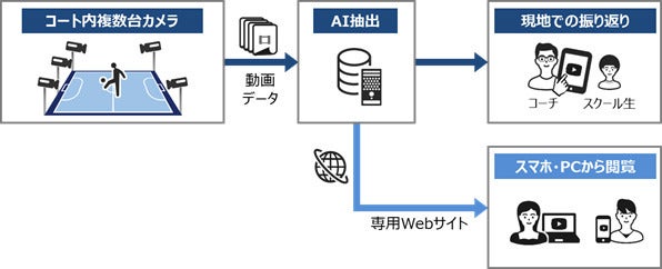 スポーツ動画センシングは、競技映像からプレーヤーやボールなどの動きを自動で検知し、プレーヤーの追尾、シュート・ゴールシーンの競技シーンを自動で抽出する技術となる。両国コートに導入する自動録画システムは、フルハイビジョンで複数のアングルの映像を自動録画するもので、プレーヤーはその場で競技映像をタブレット端末などから視聴できる。
