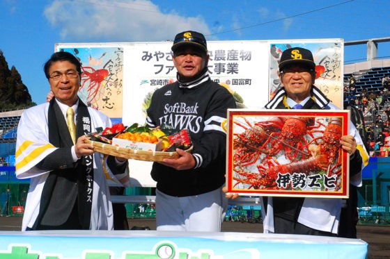 宮崎県、宮崎市、宮崎商工会議所などによる「福岡ソフトバンクホークス宮崎協力会」が4日、ソフトバンクに宮崎の特産品を贈呈。工藤公康監督が贈呈式に出席した。