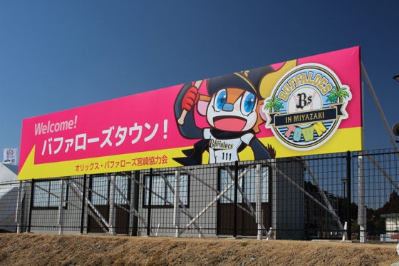 バス停から坂を上っていくと春季キャンプ地が見えてくる。正面には、「バファローズタウン」の大きな看板。右手に雨天練習場の「日向夏ドーム」と多目的グランド、さらに進むと左手に2軍が使用する第2球場、そして正面に1軍が使うメイングランドの「SOKKENスタジアム」。全ての施設は無料で、特にブルペンは12球団最大の規模となっておりお勧めだ。