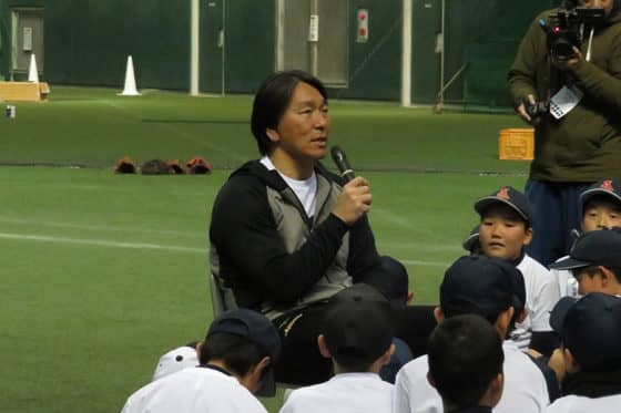 教室の後半には、松井氏自らフリーバッティングを実演するコーナーもあり、現役時代を彷彿とさせるバッティングフォームから鋭い打球を飛ばし、子供たちからも大きな歓声が上がった。最後の質疑応答のコーナーでは、1992年の夏の甲子園2回戦、星稜対明徳義塾での松井氏の5打席連続敬遠の質問が子供から飛び「よく知っているね? まだ生まれていないでしょ?」とビックリしながらも「あれがその後の僕のパワーになった。野球をやるいいエネルギーになった」と語った。