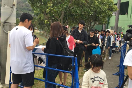 練習後サインに応じる清宮幸太郎(左端)【写真:沢井史】