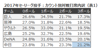 一方、最下位だった中日投手陣は巨人と対照的に、ほぼあらゆるカウントでストライクゾーンへの投球が少ない(表6参照)。カウントが浅いうちからボール球が多く、0-2に追い込んだ後のストライクゾーン投球の少なさは他球団とある意味で一線を画した数字となっていた。