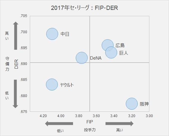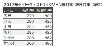 中日投手陣のデータをもう少し詳しく探ってみたい。上の散布図は奪三振、与四球、被本塁打の3つの成績で基本的な投手力を計るFIPを横軸に、本塁打を除いたインプレー打球をアウトにした割合を表すDERを縦軸に取ったものだ。右側に位置するほど投手力が高く、上側にあるほど守備力が高いことを示している。これを見ると、中日は投手力こそ低いが、守備力のあるチームということが分かる。また、ストライクゾーンでの成績も決して悪くはない(表2参照)。ゾーン内への投球増加で被打率などが悪化する可能性は大いにあるが、そのリスクを守備力で比較的小さくできるチームと考えていいかもしれない。