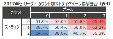 表4は、セ・リーグ全体のカウントごとのストライクゾーン投球割合を示したものだ。色合いは赤色が濃いほどストライクゾーンへの投球が多く、青色が濃いほど少ないことを表している。投手は2-0などの投手不利なカウントほどストライクゾーンに投げ込むし、0-2のような投手にとって有利なカウントではボール球を使う余裕があるのでストライクを投げない、という傾向が見てとれる。