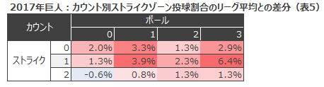 2016年のヤクルトは、17年の中日と同じくストライクゾーンへの投球割合が低く、リーグ平均と比較してすべてのカウントでマイナスだった(表8参照)。それが17年は全体的に増加し(表9参照)、与四球率、防御率ともに前年より改善を見せた。
