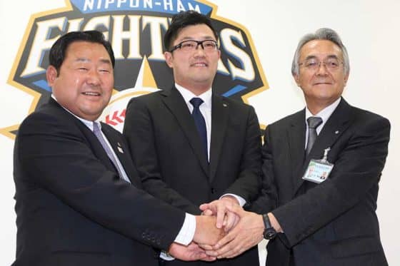 日本ハム・竹田球団社長、池田氏、安久津町長(左から)【写真:石川加奈子】