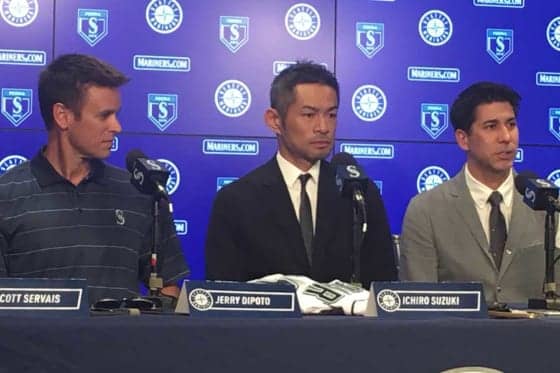 マリナーズは7日(日本時間8日)、マーリンズからフリーエージェント(FA)となっていたイチロー外野手と正式契約を交わしたと発表した。イチローは、米アリゾナ州ピオリアにある球団キャンプ施設内で、ジェリー・ディポトGM、スコット・サービス監督、代理人のジョン・ボッグス氏らと入団会見に出席。「いずれまたこのユニフォームを着てプレーをしたいという気持ちが、心のどこかに常にあったんですけど、それを自分から表現することはできませんでした」と本音を明かす一方で、「目が潤んでいるように見えるとしたら、時差ボケの影響だと思います」とお得意のウィットも披露し、会場に集まった日米合計60人の報道陣から爆笑を誘う場面もあった。