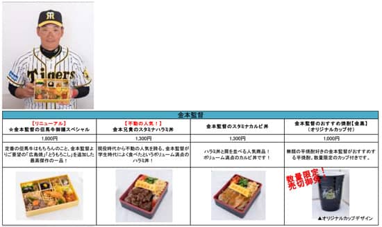 昨シーズン人気上位だった「金本監督の但馬牛御膳スペシャル」は、リニューアル。金本監督からの要望に応え、広島焼、とうもろこしを追加している。「金本兄貴のスタミナハラミ丼」「金本監督のスタミナカルビ丼」「金本監督のおすすめ焼酎」も昨シーズンに続き、販売する。