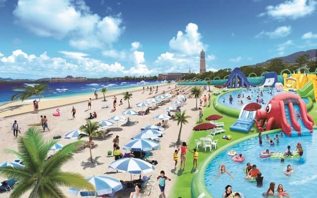 真っ白な砂浜の「WAIWAIビーチ」には、ジェットコースターのような急降下と急上昇を体験できる「ブーメランスライダー」、約90mの直線を滑走する「ウォーターロングスライダー」などのスライダー、直径20mの3つの大プールを設置する。昼間営業9:00~18:00、夜間営業19:00~22:00。パスポート対象、その他500円。