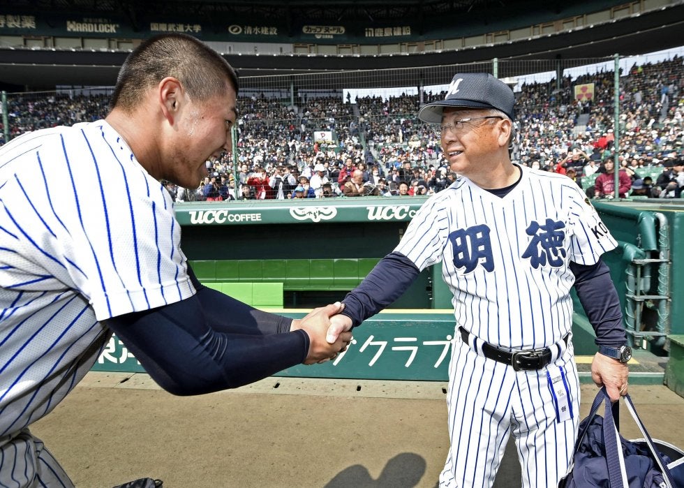明徳義塾-中央学院 初戦を突破し、逆転サヨナラ3ランを放った谷合(左)と握手をする明徳義塾・馬淵監督=甲子園【写真提供=共同通信社】