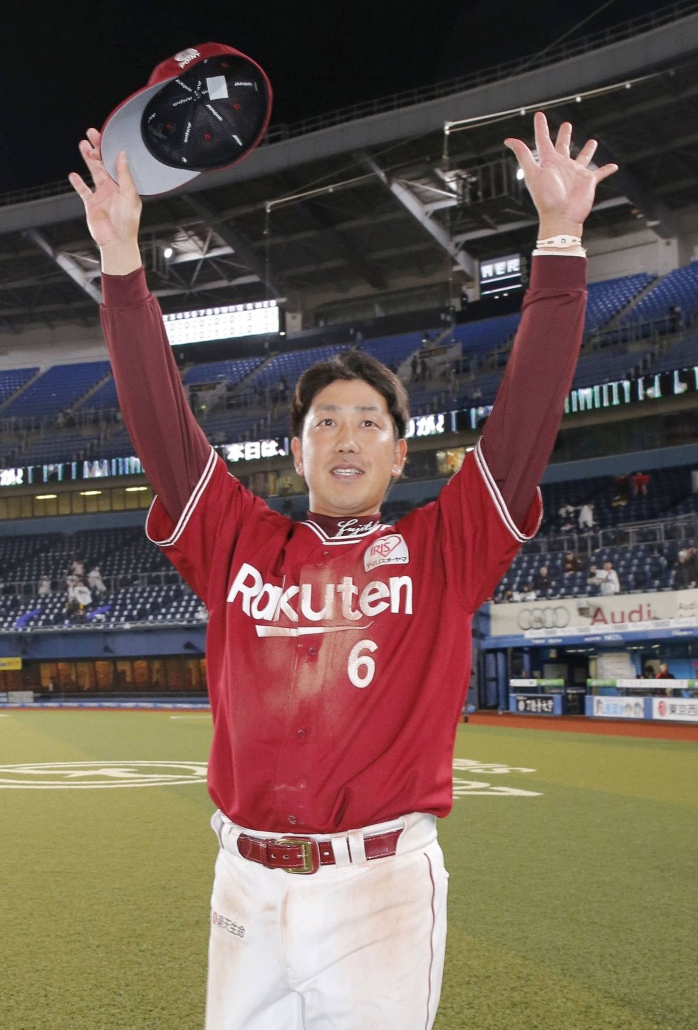 ロッテに勝利し、ファンの声援に応える楽天・藤田=ZOZOマリン【写真提供:共同通信社】