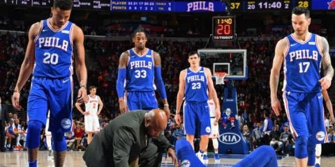 6年ぶりのプレーオフ進出が決まり、東カンファレンス3位浮上も視野に入るセブンティシクサーズに、大打撃となるアクシデントが発生した。ニックス戦でジョエル・エンビードがケガをし、戦線離脱することになったのだ。チームも本人も慎重になっていた古傷の右足、左ひざではなく、マーケル・フルツとの衝突によるアクシデント。ホームでのニックス戦に118-101で勝ち、連勝を今シーズン最長の8に伸ばしたシクサーズだが、試合後の話題はエンビード一色となった。