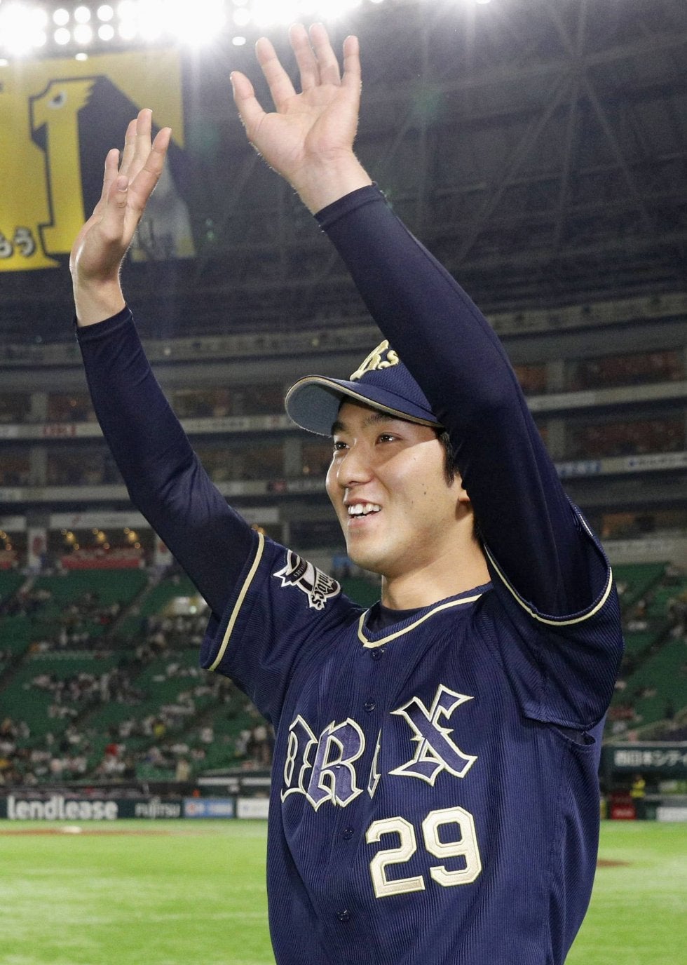 先発したソフトバンク戦でプロ初登板勝利を飾り、笑顔で手を振るオリックス・田嶋=ヤフオクドーム【写真提供:共同通信社】