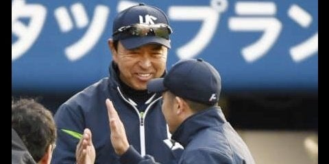 DeNAに2連勝し、先発の石川(右)を迎えるヤクルト・小川監督=横浜【写真提供:共同通信社】ヤクルトは1点を追う3回表、…