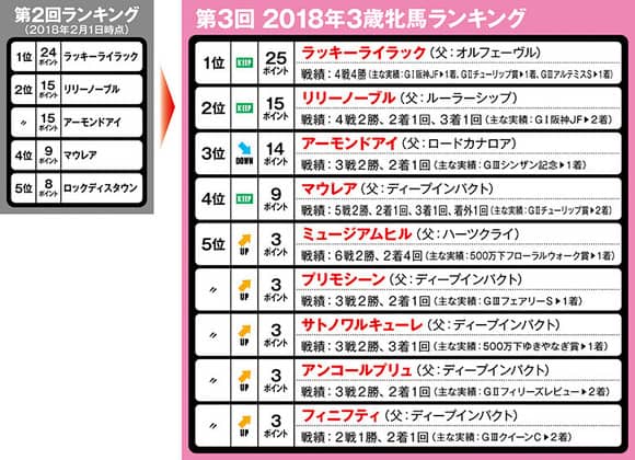 前回は、リリーノーブルと同ポイントで2位タイだったアーモンドアイ(父ロードカナロア)が、今回はわずかに1ポイント減らして3位。牡馬相手のGIIIシンザン記念(1月8日/京都・芝1600m)での勝利は圧巻だったが、そこから直行で桜花賞に向かう”変則ローテーション”が嫌われたのだろうか。