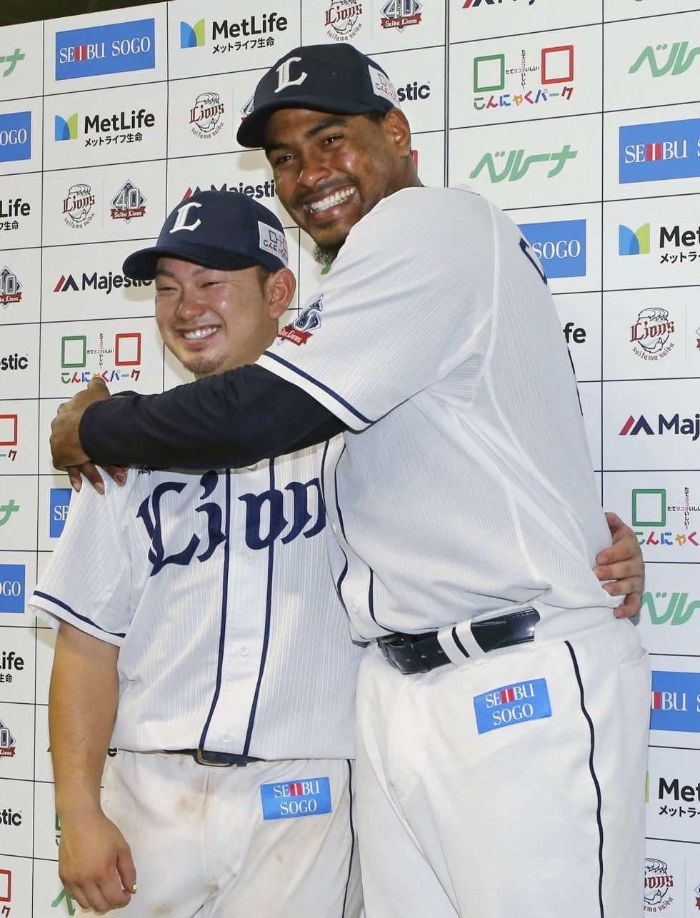 お立ち台で抱き合う西武の森(左)とカスティーヨ=メットライフドーム【写真提供:共同通信社】