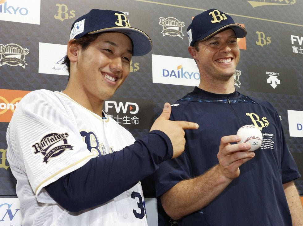 来日初登板で初勝利を挙げ、ウイニングボールを手に写真に納まるオリックスのアルバース(右)と吉田正=京セラドーム【写真提供:共同通信社】