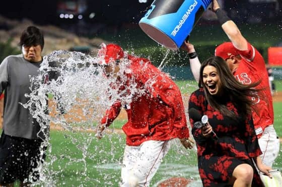 試合後のフィールド上で地元テレビ局「FOXスポーツ・ウェスト」の取材を受けていたヒーローの背後から、筋骨隆々の30歳が足を忍ばせながら猛ダッシュ。両手に抱えていたのは、試合中に選手が水分補給するためにダグアウトに置いてある、ドリンク「パワーレード」満載の巨大なタンクだった。身長193センチの大谷の背後にたどり着き、頭上から思い切り浴びせた。