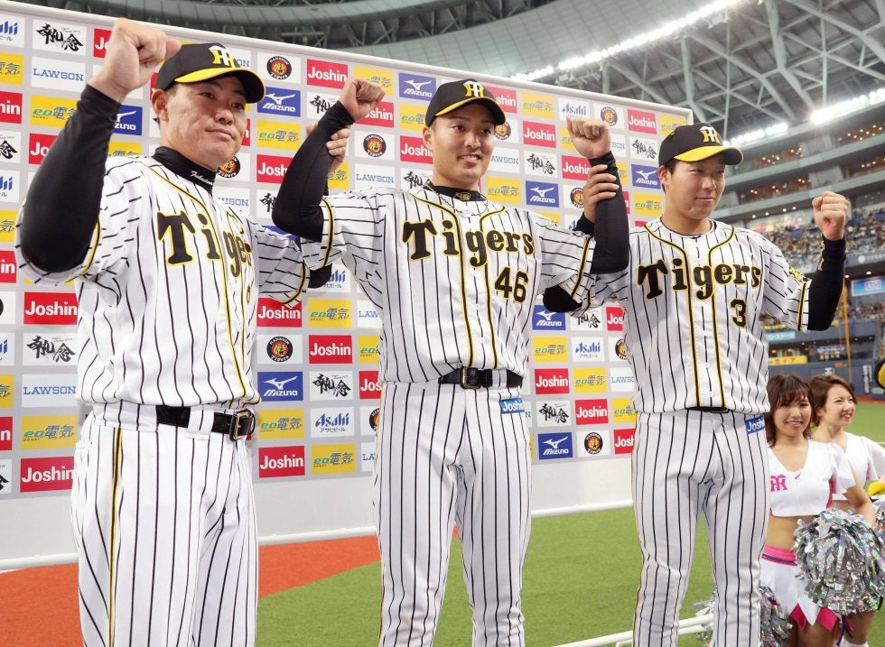 中日に勝利し、写真に納まる阪神の(左から)福留、秋山、大山=京セラドーム【写真提供:共同通信社】阪神は初回、2死一二塁か…