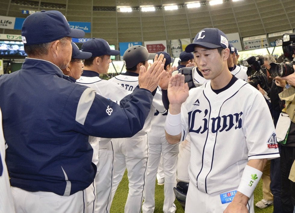 オリックスに勝利し、辻監督(左)とタッチする西武・外崎=メットライフドーム【写真提供:共同通信社】西武が1991年以来と…