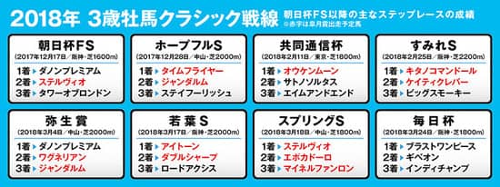 今年の3歳牡馬も質の高い面々がそろっているが、現状では「2歳王者」のダノンプレミアム(牡3歳)が頭ひとつ抜けている。昨年末のGI朝日杯フューチュリティS(12月17日/阪神・芝1600m)では、後続に3馬身半差をつける圧勝劇を披露。年明け初戦となった前哨戦の弥生賞(3月4日/中山・芝2000m)でも、「全勝対決」で注目されたワグネリアン(牡3歳)との勝負を難なく制して、クラシックの絶対的な「主役」となった。