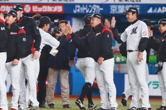 勝利したナインを迎えるロッテ・井口監督【写真:荒川祐史】