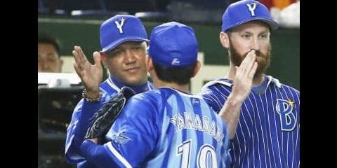 巨人―DeNA2 4連勝を飾り、山崎(19)とタッチを交わすDeNA・ラミレス監督=東京ドーム【写真提供:共同通信社】…
