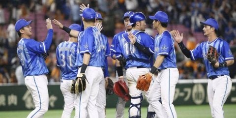 5連勝を飾り、タッチを交わすDeNAナイン=東京ドーム【写真提供:共同通信社】DeNAが5連勝。DeNAは1回表、神里の…