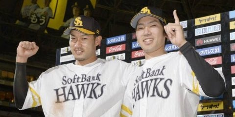 日本ハムに勝利し、お立ち台でポーズをとるソフトバンクの柳田(左)と石川=ヤフオクドーム【写真提供:共同通信社】ソフトバン…