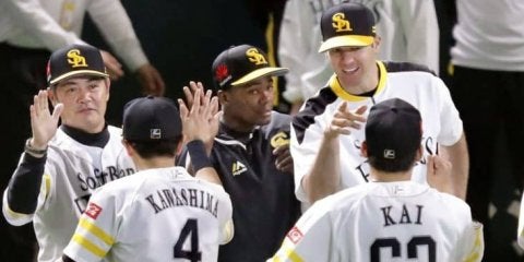 楽天に勝利し、甲斐(手前右)らナインを迎える、ソフトバンクの(奥左から)工藤監督、モイネロとバンデンハーク=ヤフオクドー…