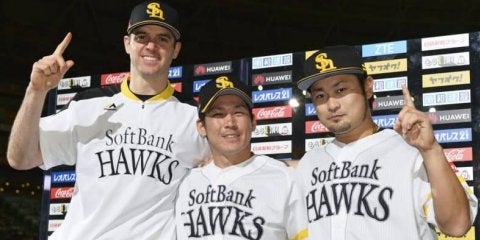 楽天に勝利し、お立ち台でポーズをとるソフトバンクの(左から)バンデンハーク、甲斐、森=ヤフオクドーム【写真提供:共同通信…