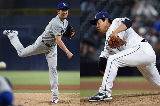 今季2勝目を挙げたドジャース・前田(左)、1回無失点の救援をしたパドレス・牧田【写真:Getty Images】