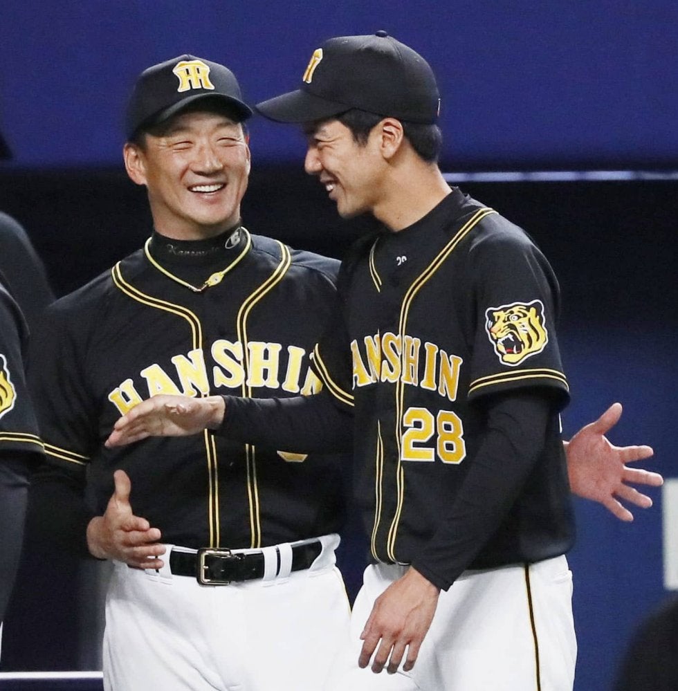 2勝目を挙げた小野(右)を笑顔で祝福する阪神の金本監督=ナゴヤドーム【写真提供:共同通信社】