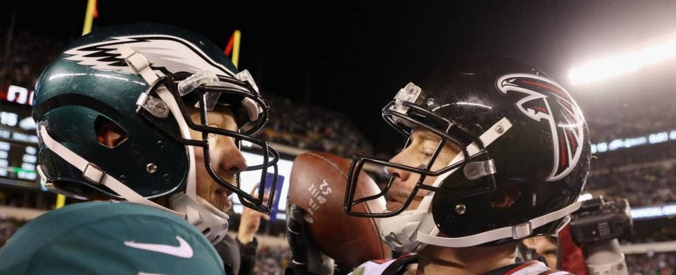 昨季のディビジョナルプレーオフ後のフィラデルフィア・イーグルスQB13ニック・フォールズと、アトランタ・ファルコンズQB9マット・ライアン(Photo by Patrick Smith/Getty Images)
