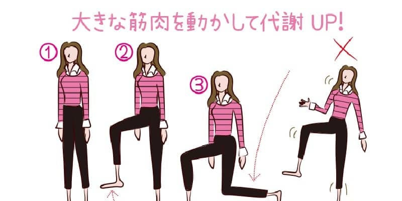 エネルギーを多く使いたい方は、左右交互に回数やセットを増やし、筋肉を鍛えたい方は、同じ脚で繰り返して行いましょう。