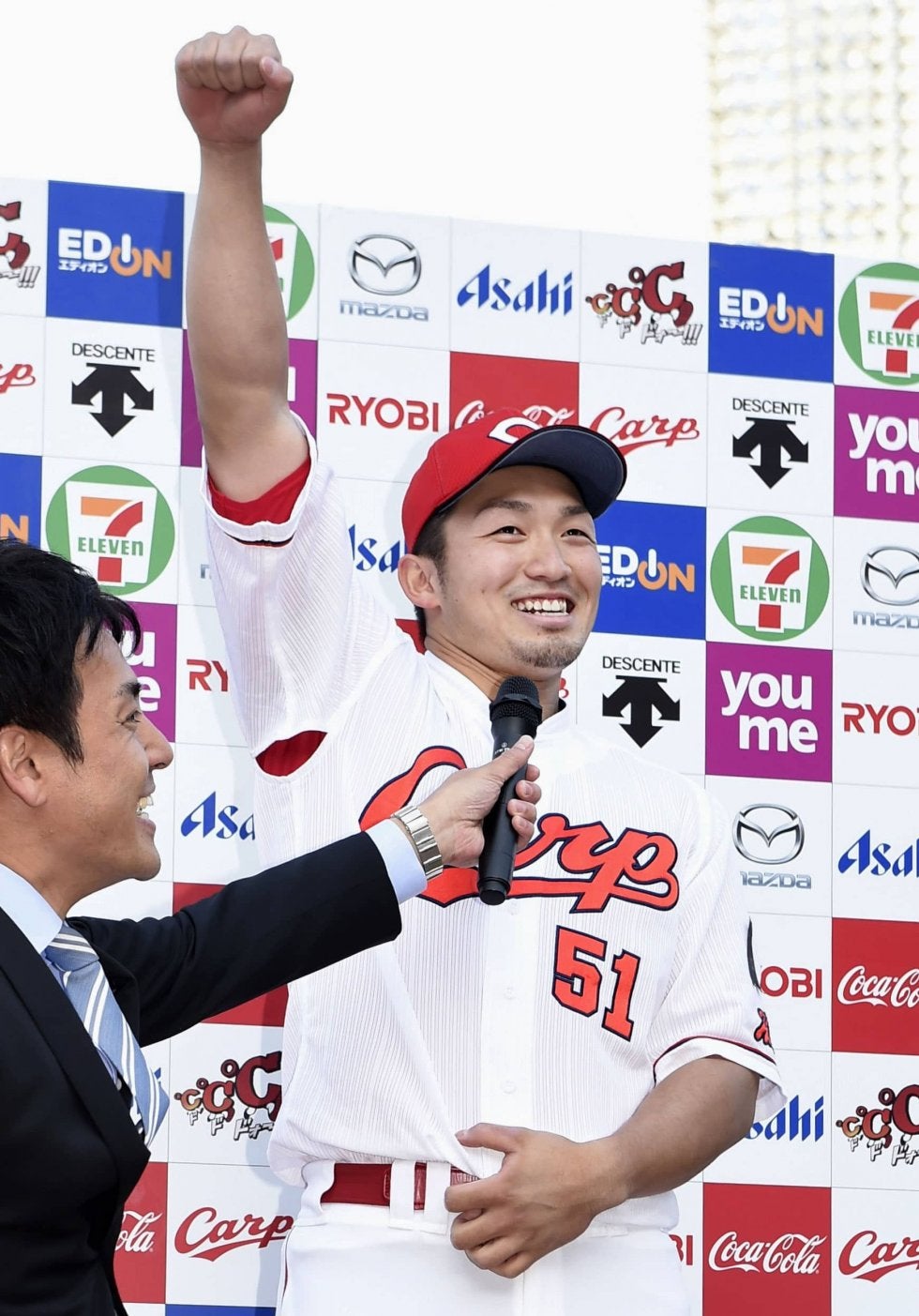 阪神に競り勝ち、お立ち台でガッツポーズする広島・鈴木=マツダ【写真提供:共同通信社】