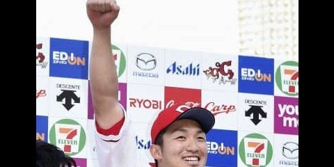 阪神に競り勝ち、お立ち台でガッツポーズする広島・鈴木=マツダ【写真提供:共同通信社】広島は2点を追う3回裏、鈴木のグラン…